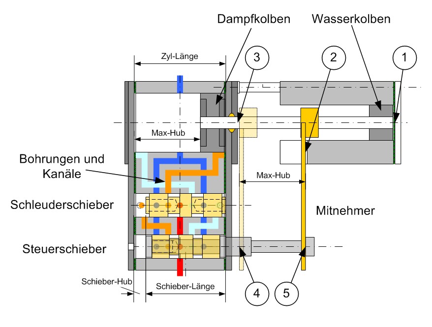 Zur inneren Steuerung gehören die Schieber und die Kanäle mit Bohrungen im Dampfzylinderkörper.