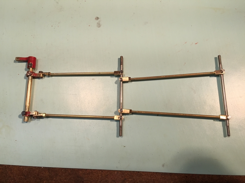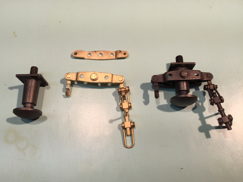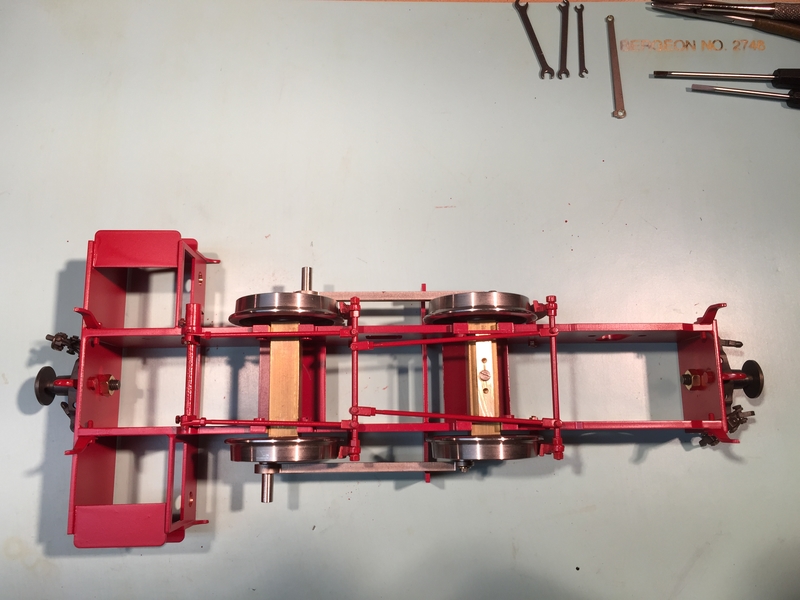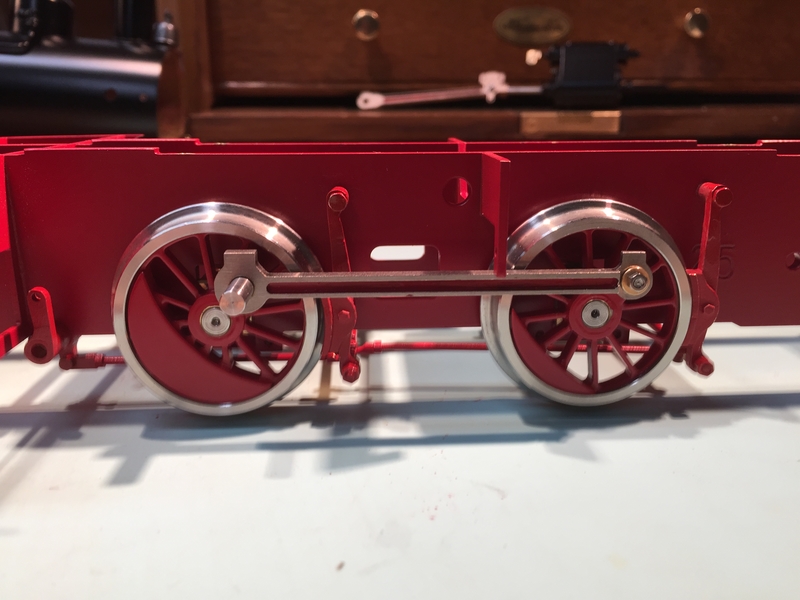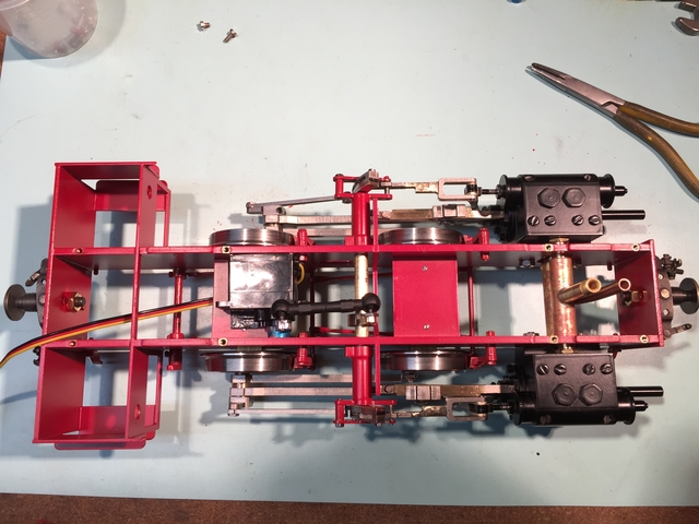 Beendet das Fahrwerk mit Gestänge. Die Umsteuerung ist vorhanden. Es dauerte einige mühsame Einrichten der Verbindungsstücke. :F01: Wie geliefert, gab es eine ganze Menge Bindung der Teile. Jetzt bewegen reibungslos.