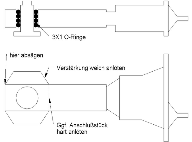 Einmal ist es mir passiert, daß sich trotz der weich angelöteten Verstärkung die 5mm Bohrung aufriss. Hier half nur noch das Trümmerteil absägen und vorsichtig ein neues Stück hart anlöten (hält wie geschweißt), was auch gelang.