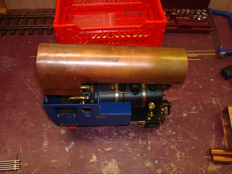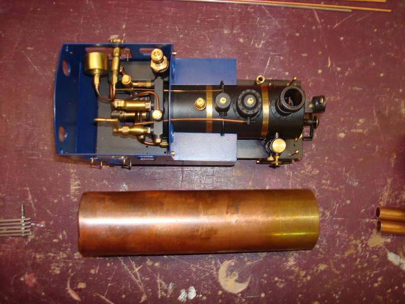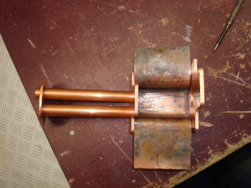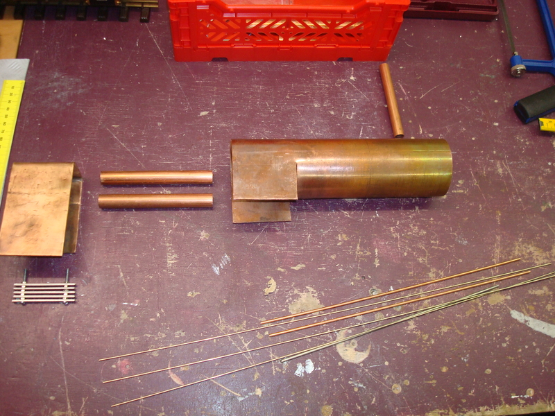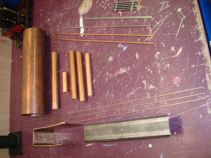 Das hintere Stahl Teil war die Biegeform für die Feuerbüchse. Die Gleich daneben Steht. Die 3 Stäbe die wie Messing Aussehen sind SilberHartlot. Rechts das Grosse Rohr wird der Kessel. Links Davon aus dem Stück Kupfer sollen die Einlötfittinge werden. Das Stück links davon wird der Kessel halter. Dann noch die 2 Rauchrohre mit 15 mm Aussendurchmesser und der Kamin, links davon. Dann im Vordergrund noch zwei 3 mm Kupferstangen. Für die Stehbolzen. Davor 3 mm Edelstahl um den Rost zu Halten. Das Vierkant eisen ist für den Rost, den ich schon Gebaut habe Bevor ich mich Entschlossen hatte einen Beitrag im Forum zu machen.