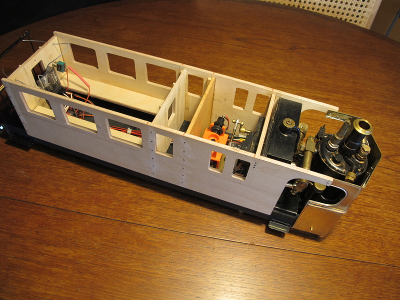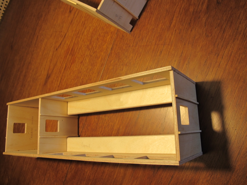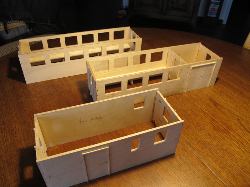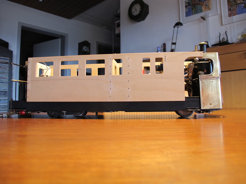 Die Karosserien aller Wagen waren ja aus schlechtem Sperrholz.Die Risse im Holz konnten weder mit normalem noch mit Spritzspachtel geschlossen werden und kamen immer wieder zum Vorschein.So habe ich mich entschlossen, alle 4 Gehäuse neu zu erstellen. Der Motorwagen bekommt eine neue Einteilung der Fenster, nur noch 3 ½ für den Passagierraum. Dafür bekommt der Maschinenraum 2 schmale Lüftungsfenter mit Jalousien oder Gitter.