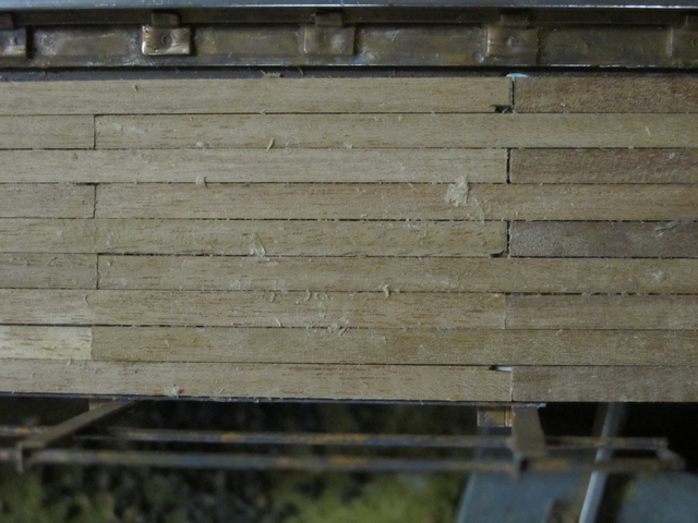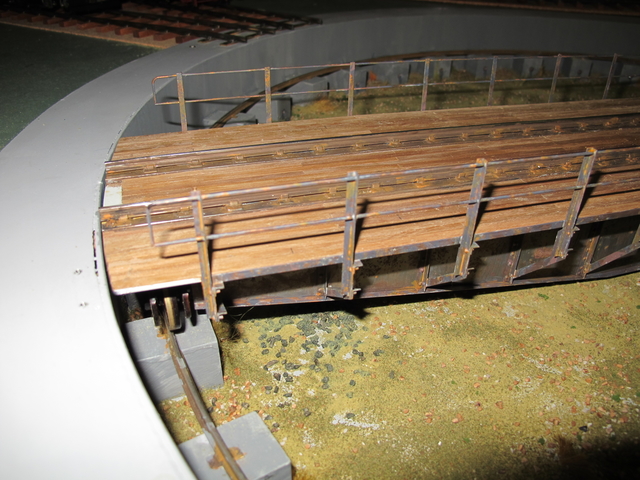Die Laufsteg Konstruktion besteht aus 5 x1 mm Winkelprofilen. Die Bretter gehen jeweils über 3 Stege, immer um 2 gegenseitig versetzt. Somit ist deren Auflage 2 x 2 ½ mm an den Enden und 5 mm in der Mitte. Verklebt ist also Messing mit Holz. Bedingt durch die Loks muss mit Feuchtigkeit gerechnet werden. Auch hier halten die Klebstellen unlösbar fest und wir vertrauen der Konstruktion.