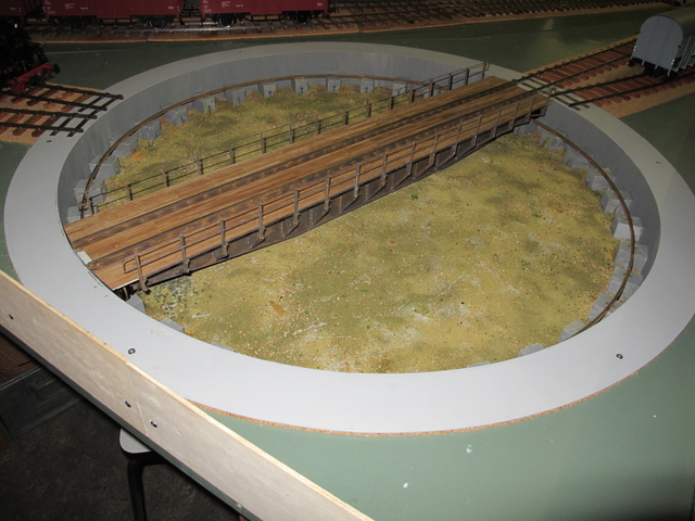 Unsere Drehscheibe ist zu 90% fertig. Der Rand und der Uebergang zum Grundbrett werden noch bearbeitet, auch die Verriegelung der Bühne montiert.