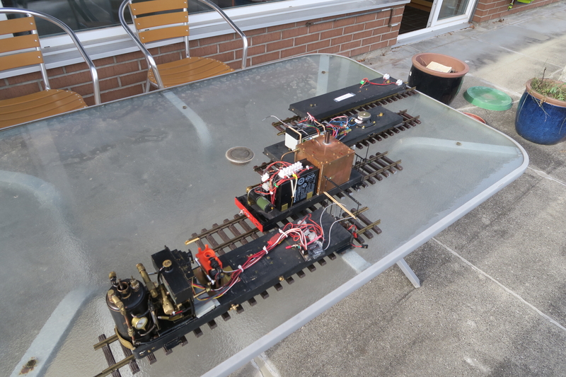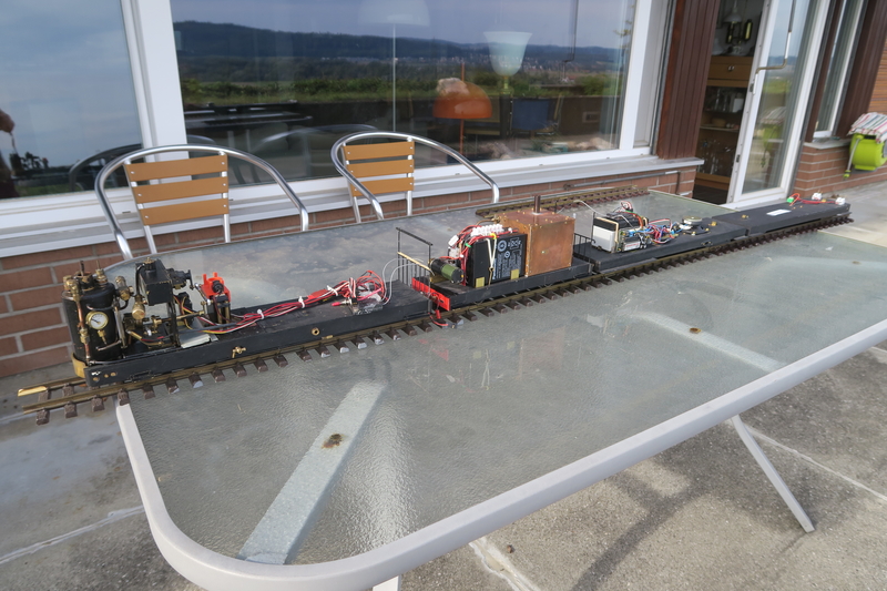 eine weitere Etappe ist fertiggestellt. Die gesamte Elektrik und Elektronik ist nachgearbeitet, kontrolliert und alle Chassis nun bereit. Den ganzen Zug auf den Bildern zu fotografieren, so dass man die Details erkennen kann, war schwierig. Die Komposition wird, wenn fertig gekuppelt, knapp 1,8 m lang. Die Reihenfolge ist Lok, Pumpen - und Wasserwagen , Combine mit Geräusch, Steuerwagen. Die Lok ist hinten und stosst.