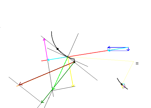 Nun ist die hellgrüne Kraft die Normalkraft des Kulissensteins in der Schwinge. Bei guter Schmierung und wenn alles in Bewegung ist, sollte bei Gleitreibung der Reibungskoeffizient nicht größer als 0.2 sein, eher kleiner als 0.1 demzufolge ist die Reibungskraft, die den Kulissenstein am springen hindern könnte (lila im Detail rechts, 0.1 * grüne Kraft) und sich auch noch einmal aufteilt, deutlich kleiner als die Haltekraft (gelb), die die Schieberschubstange an den Aufwerfhebel ableitet.