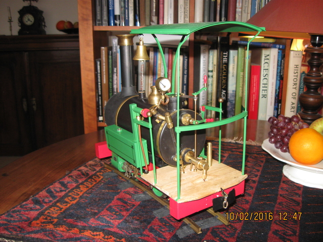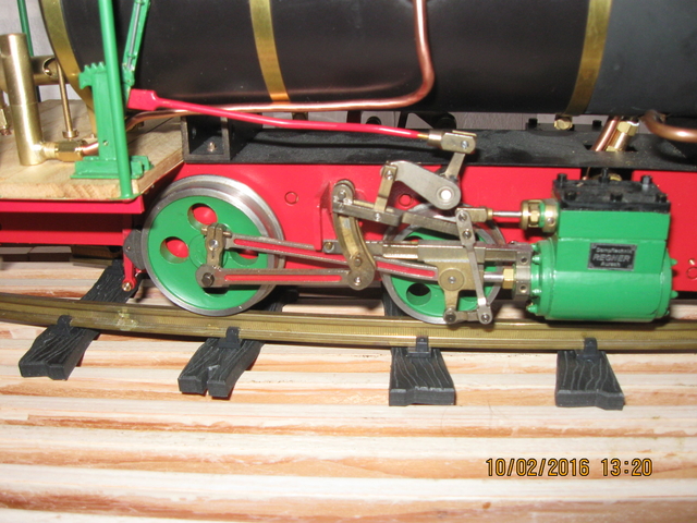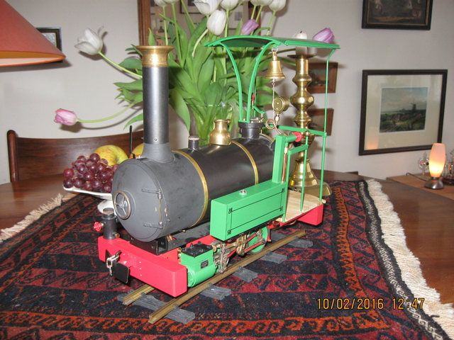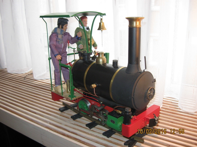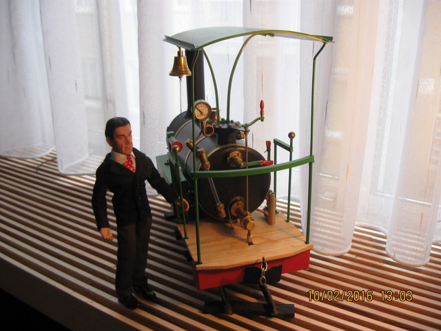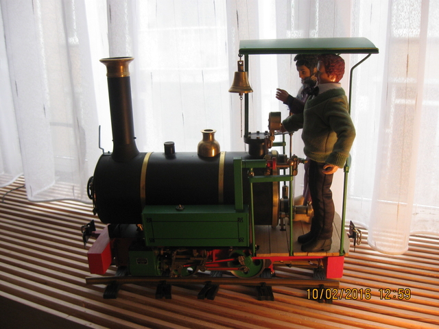 Die Lokomotive ist jetzt für 95% fertig. Es gibt noch einige kleine Sachen: hölzerne Handgriffe am Dampfregler und Entwasserungshebel um mich die Finger nicht zu brennen, es muss noch ein Hebel für die Bremse kommen, ein Messing Nummer am Schlot, Deckel auf die Gas- und Wasserfüllpunkten usw.