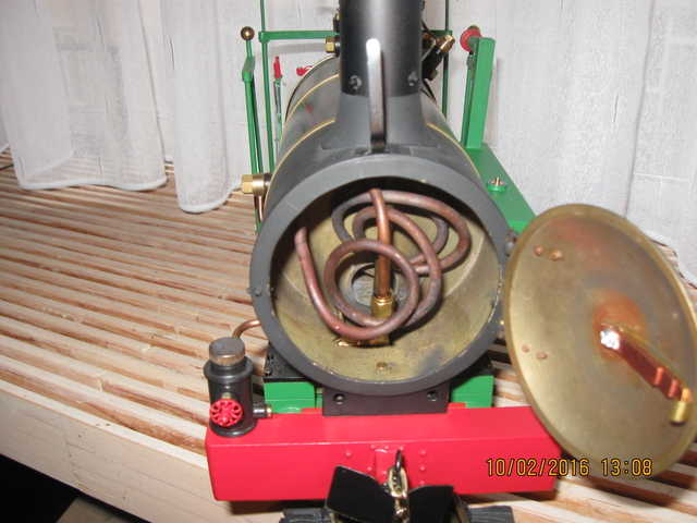 Der Kessel war damals nicht mehr lieferbar, also kommt von eBay. Nun ist er natürlich wieder lieferbar. Es war klar warum den Kessel verkauft wurde: eine Art von Innenrauchkammer war da und der Brenner war zum Teil zusammengepresst: also Brennerproblem. Erst wurde der Brenner wieder zurechtgebogen mittels ein Rundholz (Bleistift) danach muss experimentiert werden. Das Problem wurde verursacht weil die Überhitzerrohre dem Feuerrohr blockierte. Das Feuer konnte nicht zurückspringen. Die Rohre konnten einfach aus dem Wege gebogen werden. Ich bin noch nicht völlig zufrieden mit dem Feuerbild, das wird also noch experimentieren mit Luftzufuhr, Spirale, Stahlgitter, aber das ist Teil der Dampfspielerei.