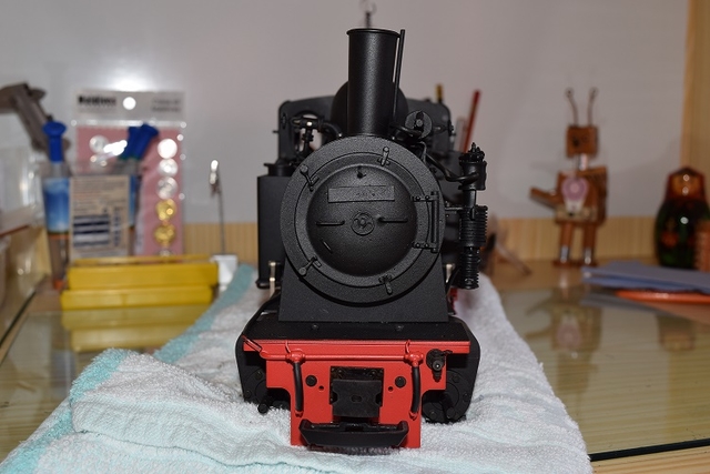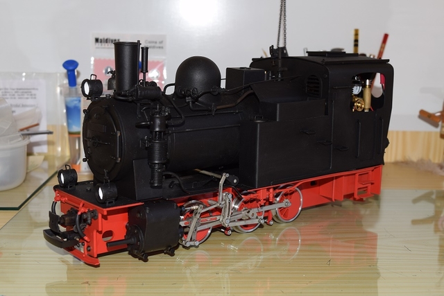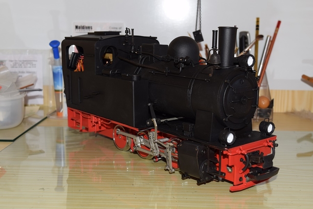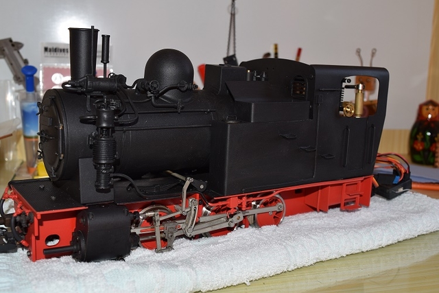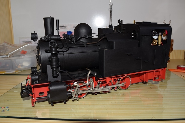 Mein derzeitiger Baustand ist auf den Bildern zu erkennen. Die Lok ist also bald fertig. Zum Einstellen des Dampfhahns habe ich sie schon 3 mal Probe laufen lassen und bin schlicht weg begeistert. Ein super Fahrgefühl, ein super Sound und schlichtweg eine Super-Lok. Die automatische Entwässerung ist auch eine Show. Anfangs tropft das Wasser schön heraus. Während des Fahrens, treten dann kleine Dampfstösse aus. Das wird bestimmt bei kalten Temperaturen wunderschön anzusehen sein. Der Dampfaustritt tut aber keinen Abruch. Brenner und Kessel haben genug Reserven für ein langes Fahren.