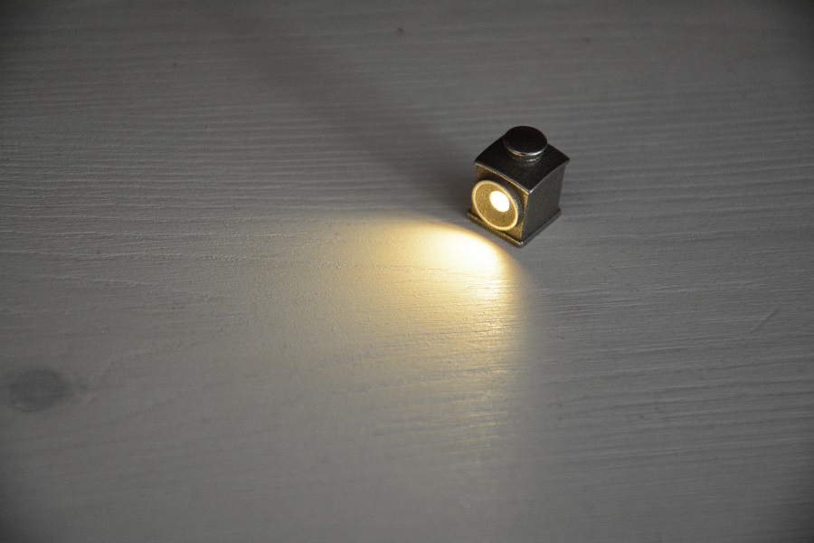 Das Lampengehäuse ist in Edelstahl gedruckt. Es enthält zwei LR60 Knopfzellen und eine 3mm warmweiße LED. Einen Schalter gibt es nicht. Ich teste jetzt mal, wie lange die Batterie hält.