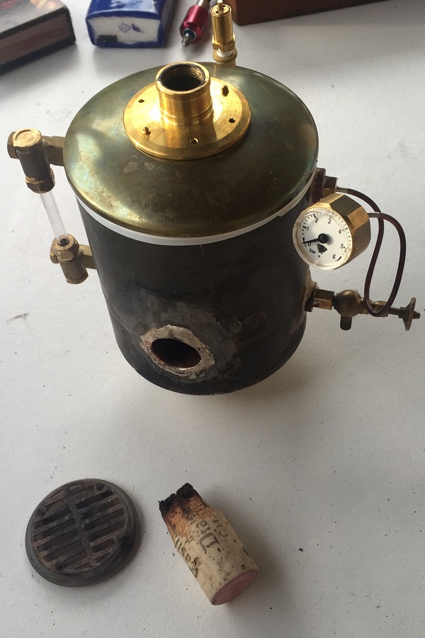 ich habe gestern Abend provisorisch einen Hilfsbläser montiert und siehe da, der Kessel kann problemlos aus eigener Kraft sein Feuer halten. Habe dann mit reichlich abblasenden Sicherheitsventil die Verdampfungsleistung versucht zu messen und bin auf 0,5 Liter in 35min gekommen. Da mache ich mir keine Sorgen, dass das nicht ausreicht. Nun kann mit der Konstruktion der Lok begonnen werden.