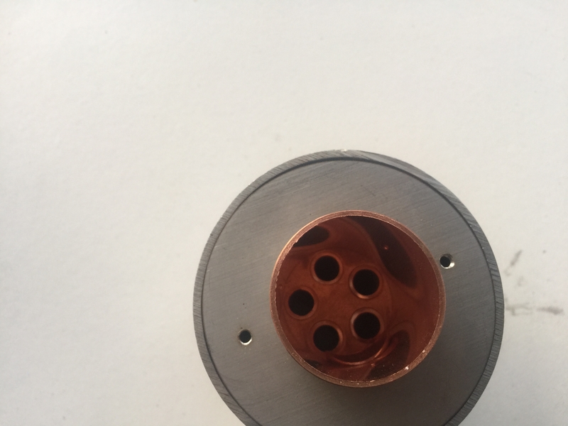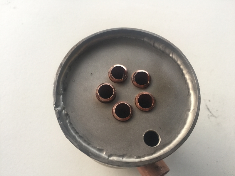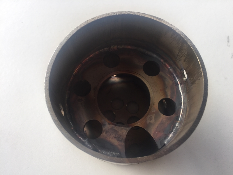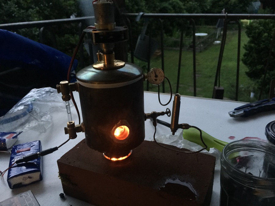 Soeben habe ich die maximale Schornsteinhöhe von 26mm über dem "Deckel" ermittelt, auf den Bilder seht ihr nur den Schornsteinfuß mit Innengewinde. Mit dem SChornstein wird dann auch der Betrieb mit Hilfsbläser getestet.