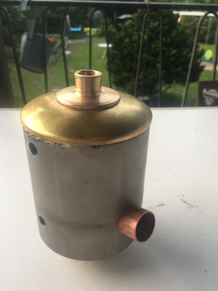 schon seit einiger Zeit brüte ich an einem selbstgebauten Kohlekessel. Ich wollte gerne mal einen Stehkessel versuchen. Das ganze soll dann in einer Freelance-Kastendampflok mit oszillierender Dampfmaschine betrieben werden. Die Lok selber ist noch nicht im Detail geplant, erstmal muss sich herausstellen, dass der Kessel funktioniert. Hier is er: