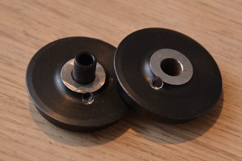 Nun stellte ich 2 Probleme fest: Die Räder haben einen Kunststoffkern wegen der elektrischen Isolation. Grundsätzlich stört mich das nicht, aber bei meiner Lok werden die Räder recht nah an der trockenen Feuerbüchse sein. Kann sein, dass das nicht gut geht, aber das wird die Erfahrung zeigen. Das größere Problem war, dass die Räder über einen recht massiven Bund (D=12mm) verfügen. Das kollidiert dann mit der Dampfmaschine. Wie also den Bund entfernen ohne Drehmaschine? Habe es so gemacht;