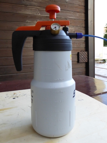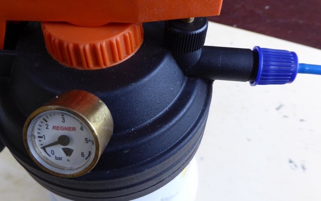 Ich hatte es schon fast aufgegeben, bis ich mein Rasenmähermesser in ein Spezialgeschäft zum Schleifen brachte. Da standen eine Menge Sprühdruckflaschen herum. Also ab zum Auto, das Schläuchlein gesucht, gefunden und siehe da es fand sich eine Bottel, auf die das Ding passte.
