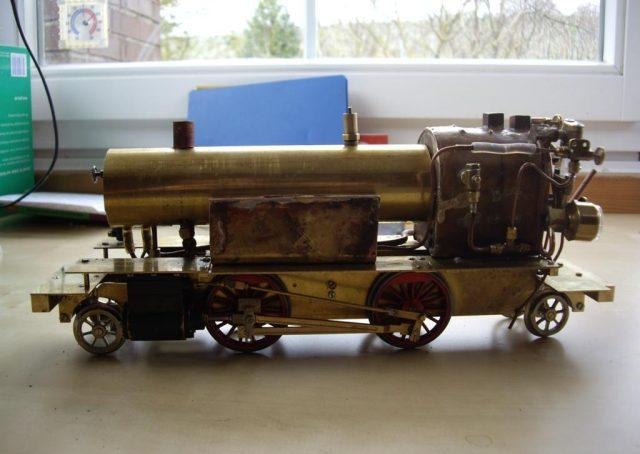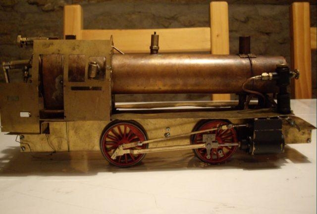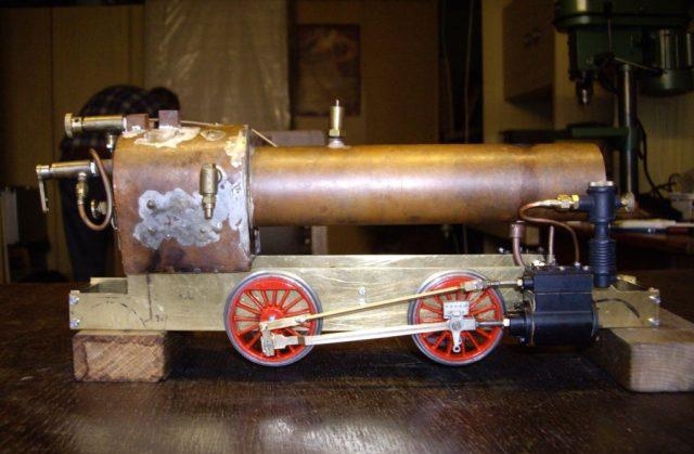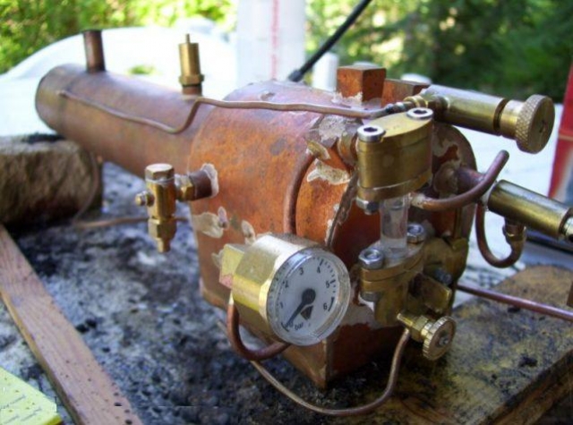 Angefangen habe ich ungewöhnlicherweise mit dem Kessel.Damit galt es mir selber zu beweisen, dass so ein kleiner Kohlekessel genug Leistung für meine Maschine bringt.Nach zwei nicht zufriedenstellenden Kesseln hatte ich einen, der genügend Dampf produziert und in dem das Feuer zufriedenstellend brennt: