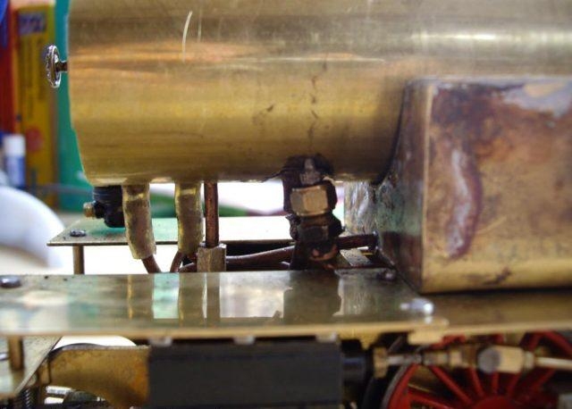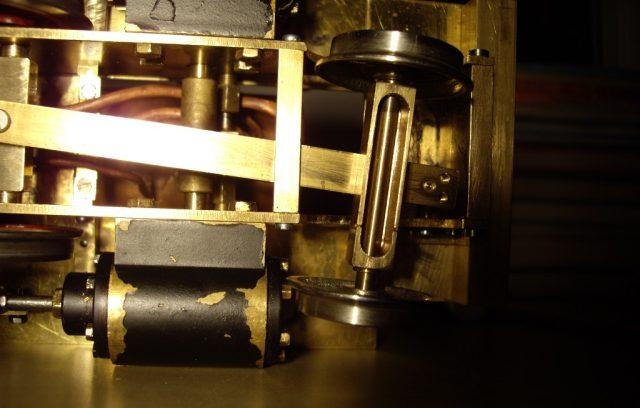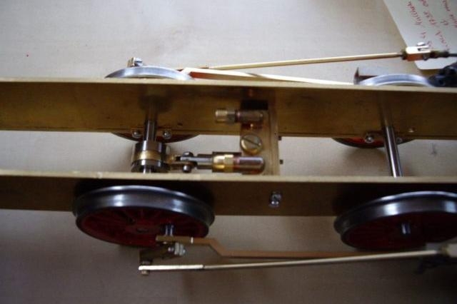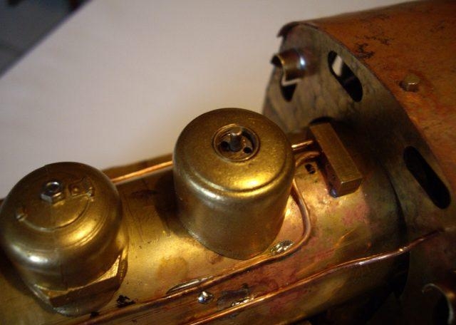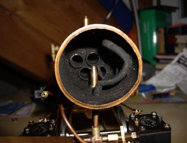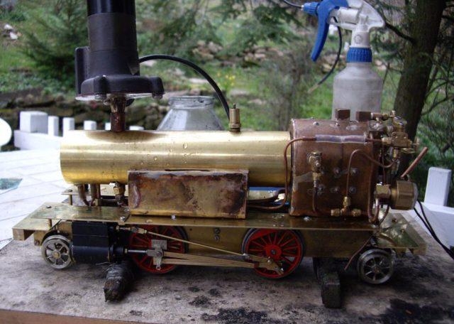 Dann kamen die ersten Tests, die sehr ernüchternd ausfielen :cry: Alles sah danach aus, dass der Kessel einfach nicht die Leistung für die Maschine bringt(immerhin 2x 20.5mm Hub und 14mm Bohrung).Ich habe dann mit der Düse herumexperimentiert(erst Höhe dann Durchmesser, schließlich waren es nur errechnete Werte mit Formeln, von denen ich nicht wusste, ob sie stimmen)und dann kam die Erlösung:Es besserte sich insgesamt von mal zu mal.Dann hatte ich sie schließlich mit zu viel Wasser und genügend Druck aufgebockt super am laufen.