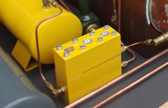 Für einen Dampfschlepper und ein Kraftwerk habe ich mir diesen Regler gebaut (hier im Kraftwerk beim Einsatz in Klein Vollbüttel). Ist aus einem bekannten Vorschlag mit Autoreifenventilen entstanden, dem ich noch ein Minimal-Druckminderer hinzugefügt habe.