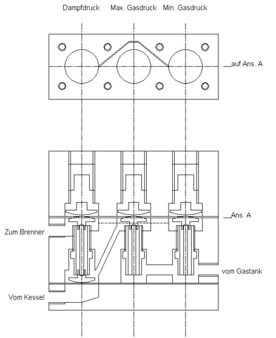 Die Reifenventile sind nur angedeutet und die Federn oben nicht eingezeichnet. Von oben werden die Ventile mit Federdruck (einstellbar) geöffnet und mit Gas- oder Dampfdruck von unten geschlossen. So sind 2 Druckminderer für max und min Gasdruck und die dampfdruckabhängige Regelung vorhanden. Während der Maximaldruck vom Dampf abgestellt werden kann, sichert der Minimaldruck (Kanal am Maximalregler vorbei) die Flamme. Mit dem Regler bin ich sehr zufrieden, außer für unsere Lok´s leider zu groß. Problem ist nur die Suche nach geeigneten Membranmaterial. Ein freundliches Mitglied eines anderen Forums hat mir ein Stück NBR mit Polamideinlage hierfür überlassen.
