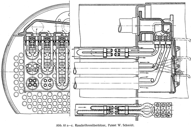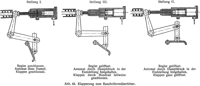 Über die erweiterten Röhren ist in der Rauchkammer ein Kasten mit Klappen in der Stirnwand eingebaut (Abb. 61 b). Durch mehr oder weniger Öffnen der Kappen kann der Zug der Feuergase durch die erweiterten Rauchröhren und hierdurch die Höhe der Überhitzung geregelt werden. Bei abgestelltem Regulator sind die Klappen durch ihr Eigen- oder Gegengewicht (auch Federn) geschlossen. Mit ihnen ist durch Hebel und Zugstange der Kolben eines kleinen Dampfzylinders (Automat) verbunden (Abb. 62), der bei geöffnetem Regulator Dampf erhält und durch den Kolben und die Hebel die Klappen mehr oder weniger öffnet und hierdurch die Überhitzung der geforderten Leistung der Lokomotive entsprechend regelt. Unabhängig von dem Automaten kann der Führer von seinem Stand aus mittels Handrads und Schraube die Klappen einstellen und so die Überhitzung regeln. Vielfach erfolgt die Regelung der Klappen nur durch den Führer von Hand. Für Lokomotiven, deren Zugbelastungen weniger schwanken, hat man die Klappen fortgelassen, nachdem durch Versuche festgestellt ist, daß hierdurch Nachteile, namentlich ein Verbrennen der Überhitzerrohre, nicht zu befürchten ist. Rauchröhrenüberhitzer für volle Besetzung, Patent W. Schmidt (Abb. 63 a und b).