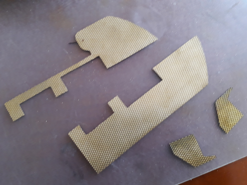 heute ging es mit dem (überraschend teuren) Riffelblech weiter. Die Teile wurden mit Übermaß mit der Laubsäge ausgeschnitten und dann mit Zweikomponentenkleber fixiert. Wenn der Kleber ausgehärtet ist werden die Teile auf Maß gefeilt: