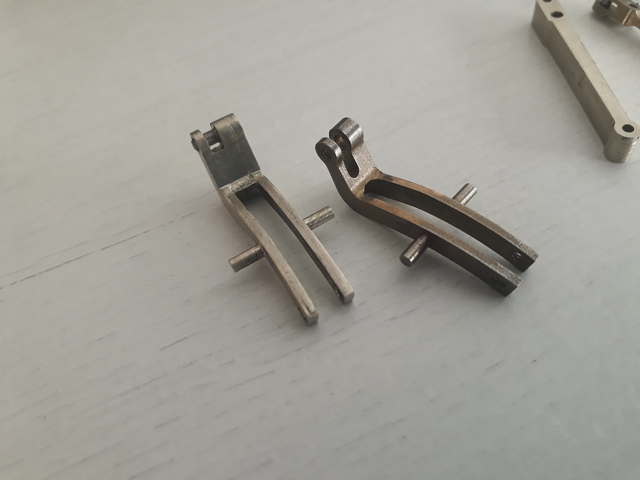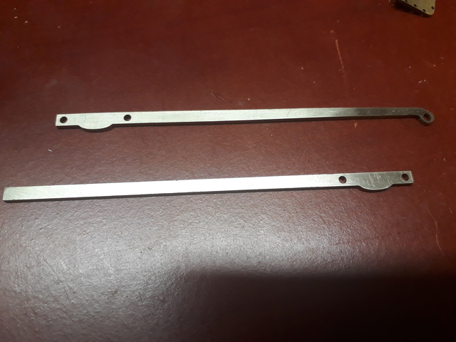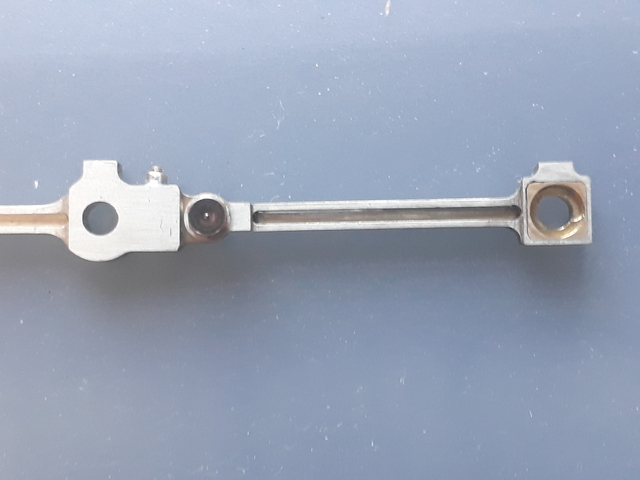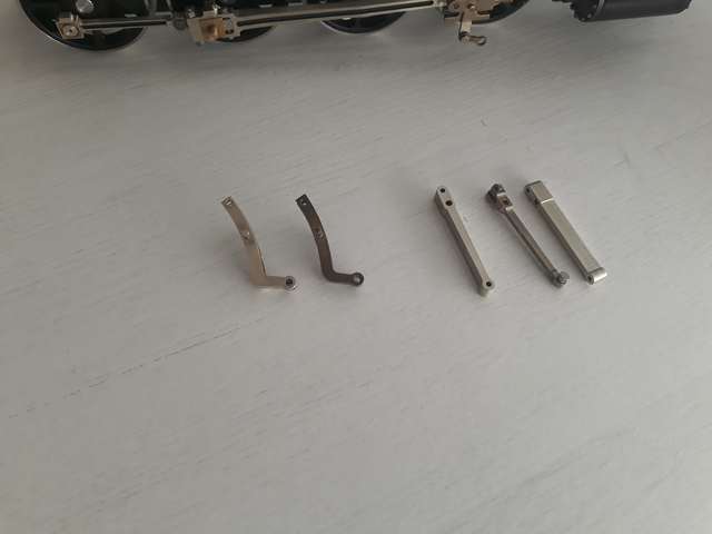 Hier im Vergleich zur Originalkuppelstange. Die Bolzen werde ich wahrscheinlich auch noch in Neusilber ausführen: