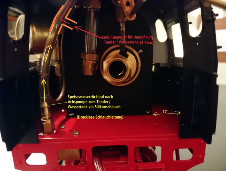 Wenn also ausreichend Druck auf dem Kessel der P 10 wäre, dann müsste sich doch Dampf in das Speisewasser im Tender leiten lassen, mit dem dieses dann auf „Betriebstemperatur“ gebracht bzw. gehalten werden könnte, oder? Es war einen Versuch wert.