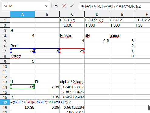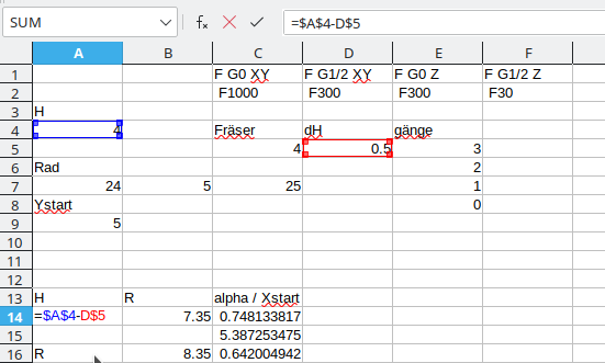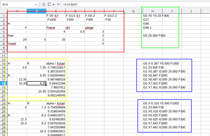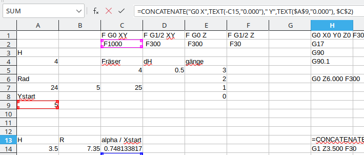 Am Ende kopiert man die Ergebnis-Textspalte H in eine Textdatei und wirft sie der Steuerung zum Fraß vor. Wenn sie etwas zu bemängeln hat, ist es ratsam, das in die Formeln einzupflegen, damit man die Anpassungen nicht jedes mal machen muss. Testlauf (mit dem Nullpunkt) weit weg von allen Anschlägen, ohne Werkzug und mit der Hand auf dem Notaus.