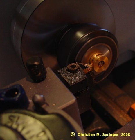 Als erstes wurden die Kolben mit einer Breite von 2 mm und einer Tiefe von 2,5 mm eingestochen, so dass in der Mitte ein Steg von 9 mm Durchmesser stehen blieb ...