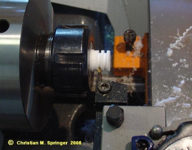 Dazu hab ich den Teflonstab außen auf 14,03 mm abgedreht und dann 1,75 mm breite Ringe ca. 1,5 mm tief eingeschnitten, so dass zwischen den Ringen Stege mit einem Durchmesser von etwa 12,05 mm stehen blieben ...
