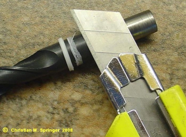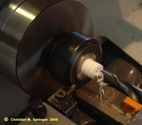 Dann wurde der Teflonstab mit einem 12 mm-Bohrer ausgebohrt ...